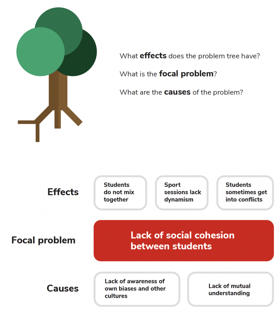 The problem tree is a method to map core problems, along with their causes and effects, which in turn can help identify clear and manageable objectives for a given intervention. A problem tree is broken down into three parts: a trunk, roots, and branches. The trunk is the core problem. The roots represent the causes of the core problem and the branches represent its effects. Problem trees are typically developed in a group exercise to make sure that various perspectives and backgrounds are considered before launching, and monitoring, a program of sessions or lessons.